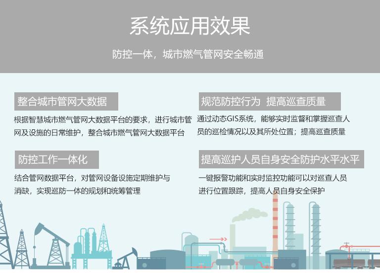 通过《智慧城市燃气GPS巡检管理系统》,规范巡检行为,强化巡查质量,实现城市燃气管网防控工作科学化、规范化、智慧化和大数据平台化的推进和实施,确保城市燃气管网安全畅通。